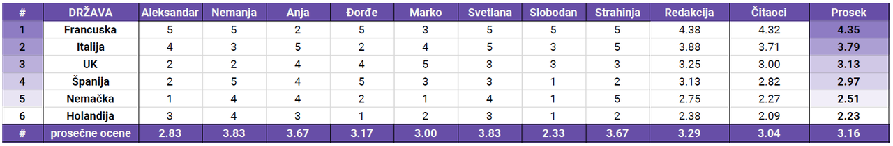U rangu „dobrih“ su UK, Španija i Nemačka, dok je najlošiji predstavnik domaćina Žangu Makroj.