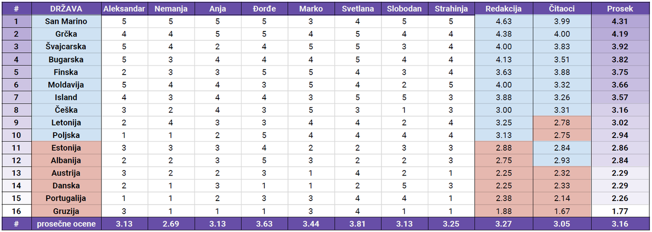 Našoj članici redakcije Svetlani Jukić ovaj put su se najviše dopale ovogodišnje pesme, budući da je njena prosečna ocena 3,71, dok je u ocenjivanju najstroži bio Aleksandar Ristić. Prosek njegovih ocena iznosi 2,93.