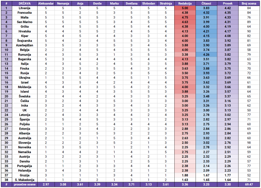 Zasluzena pobeda Litvanije u potpunosti! I celokupan poredak mi se svidja jedino smatram da su Moldavija, Island i Svedska trebali biti malo vise na tabeli ostalo je sve okej!