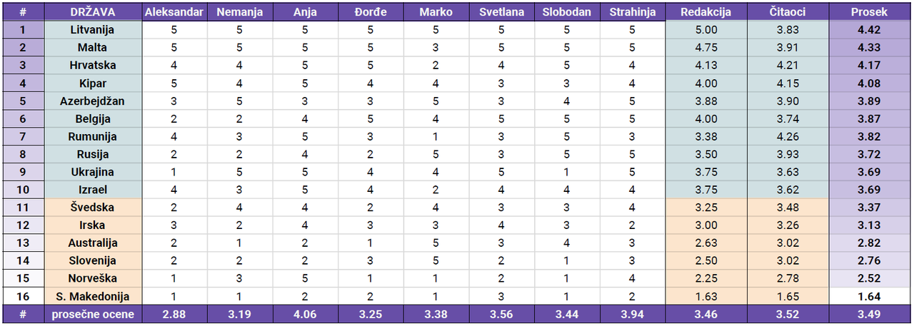 Od 38 pesama, nijedna nije dobila ocenu „odličan 5“, ako ne računamo ocene članova redakcije, koji su tri numere nagradili peticama: Litvaniju, Maltu i San Marino. Naši čitaoci, međutim, misle da nijedna pesma ovogodišnjeg Evrosonga ne zaslužuje da bude odlikaš.