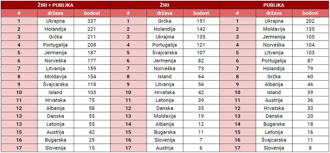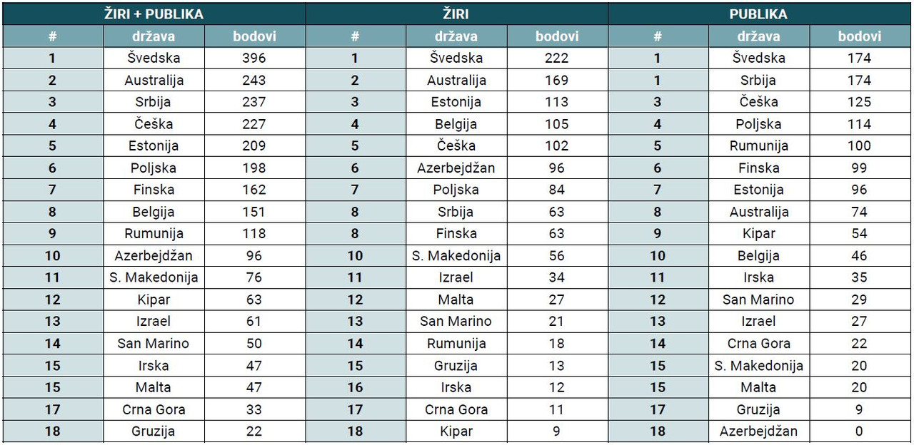 Uporedni pregled odvojenih glasova žirija i publike, kao i kombinovane bodove, pogledajte u tabelama.