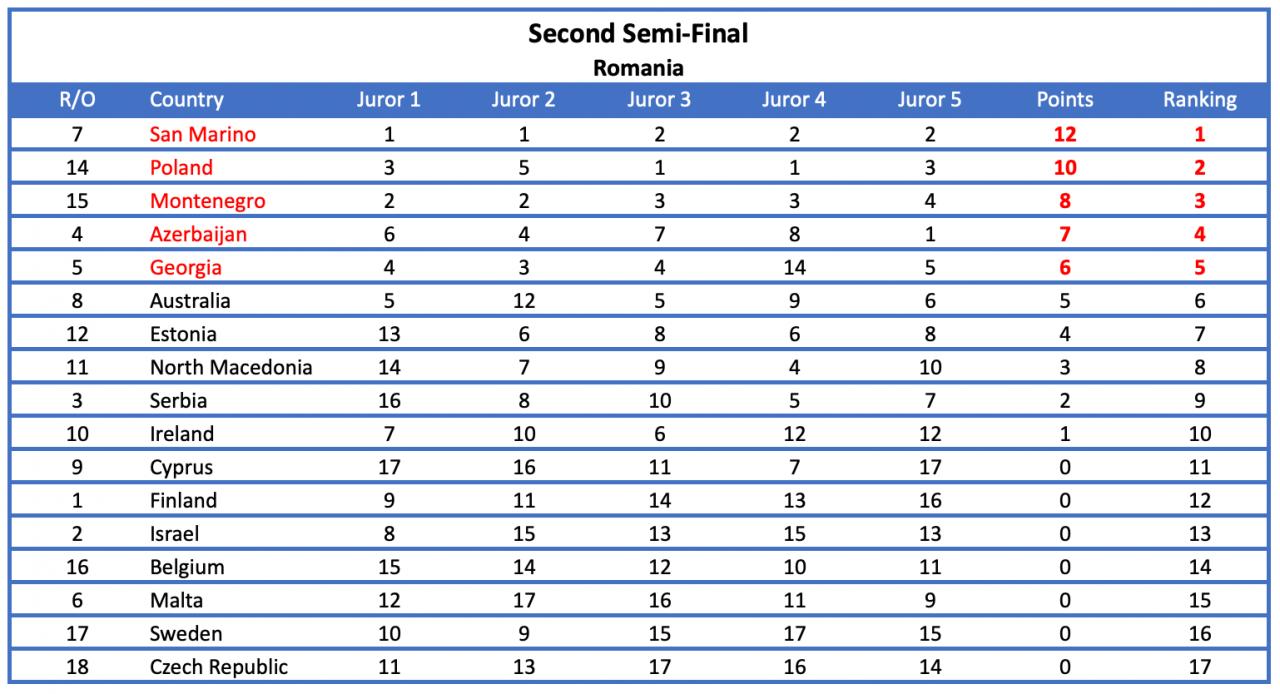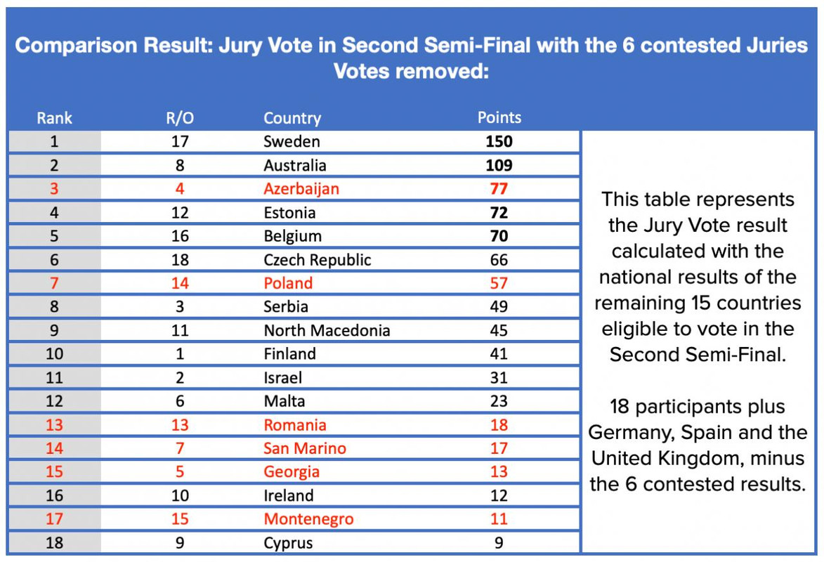 Šest država čiji su glasovi žirija uklonjeni iz takmičenja i zamenjeni rezultatima zasnovanim na prethodnim obrascima glasanja su: Azerbejdžan, Gruzija, Crna Gora, Poljska, Rumunija i San Marino. Njihovi glasovi su uklonjeni zbog neregularnosti u glasanju. Od tih šest država, žalbu jedino nije uložila delegacija San Marina.