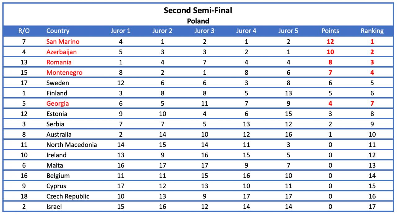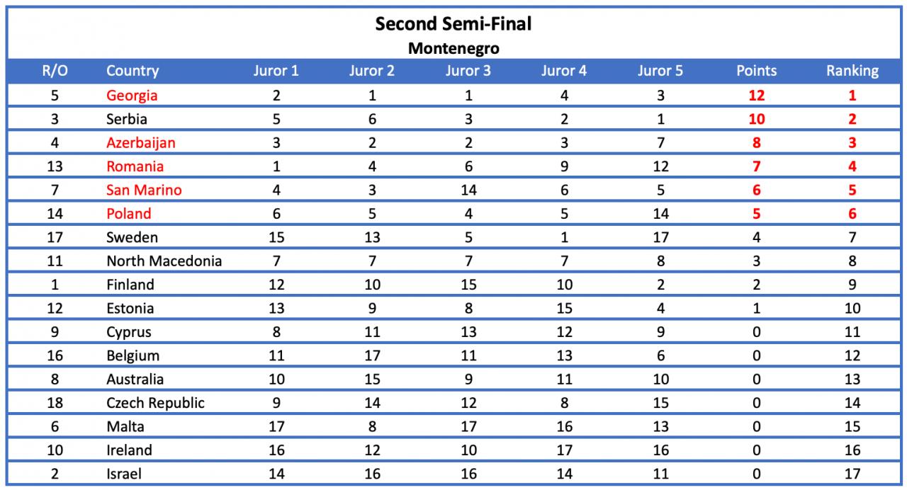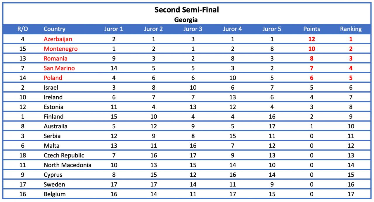U nastavku pogledajte tabele sa spornim glasovima iz šest država, a na kraju i zbirnu tabelu glasova žirija iz koje su uklonjeni žiriji iz šest država.