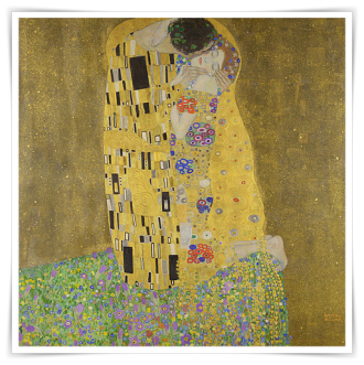 Muškarac i žena su prikazani gotovo kao da su stopljeni u jedno, sa svojim telima prekrivenim uzorcima i šarama koji su glavni deo slike. Njihovi položaji tela su sugestivni i senzualni, a ipak, poljubac je nežan.