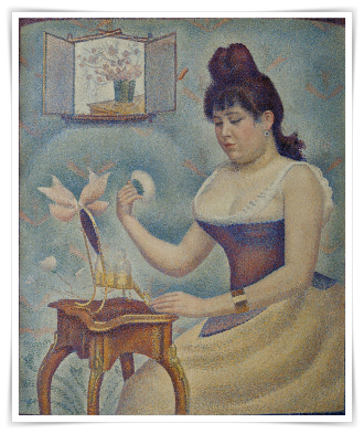 Seuratova upotreba poentilizma i suptilnog izraza lica efikasno hvata raspoloženje enuija ili dosade.