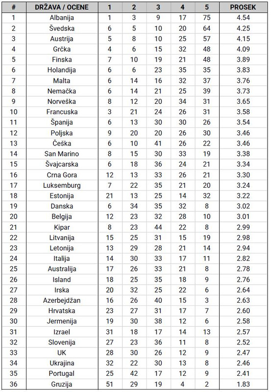 Četiri pesme dobile su prelaznu ocenu „dovoljan 2“: Slovenija, Izrael, Gruzija i Portugalija koja ujedno ima i najlošiju prosečnu ocenu i zauzima poslednje, 36. mesto (2,09).