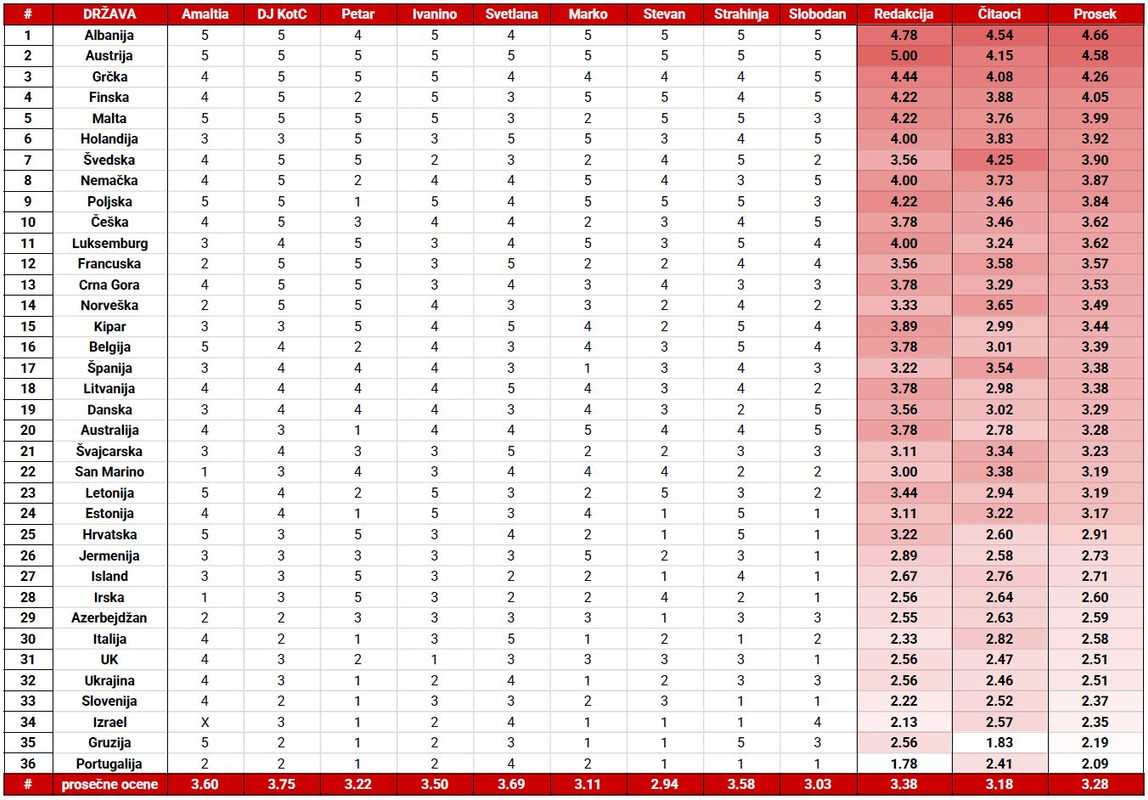 Ove godine je ukupno 105 čitalaca ostavilo svoje ocene, čime smo nastavili niz uspešnog odziva i relevantnosti. Postavljanje upitnika preko Google Forms pokazao se ponovo kao dobar potez, jer smo tako sprečili variranja u broju ocena za određene pesme. Praktično su sve numere dobile isti broj ocena; jedino je za pesme iz Izraela i Azerbejdžana glasao neznatno manji broj čitalaca — za Izrael 93, a za Azerbejdžan 100. Mogućnost neglasanja za ove pesme ostavili smo zbog specifičnih okolnosti, poštujući osećanja onih koji zbog svojih ubeđenja ne žele da glasaju za njih.