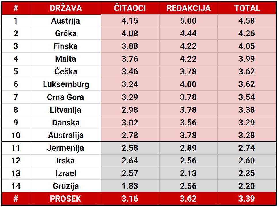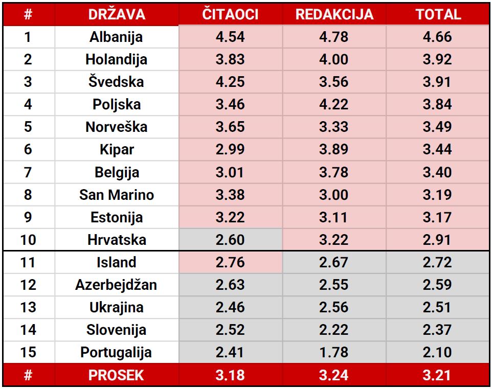 Od 36 pesama, Albanija i Austrija su dobile ocenu „odličan 5“, što se podudara i sa mišljenjem redakcije, dok su čitaoci „peticu“ dali samo Albaniji. Zanimljivo je da je albanska pesma dobila ubedljivo najviše odličnih ocena — čak 71,4% bile su petice za numeru Zjerm. Ubedljivije nije moglo!